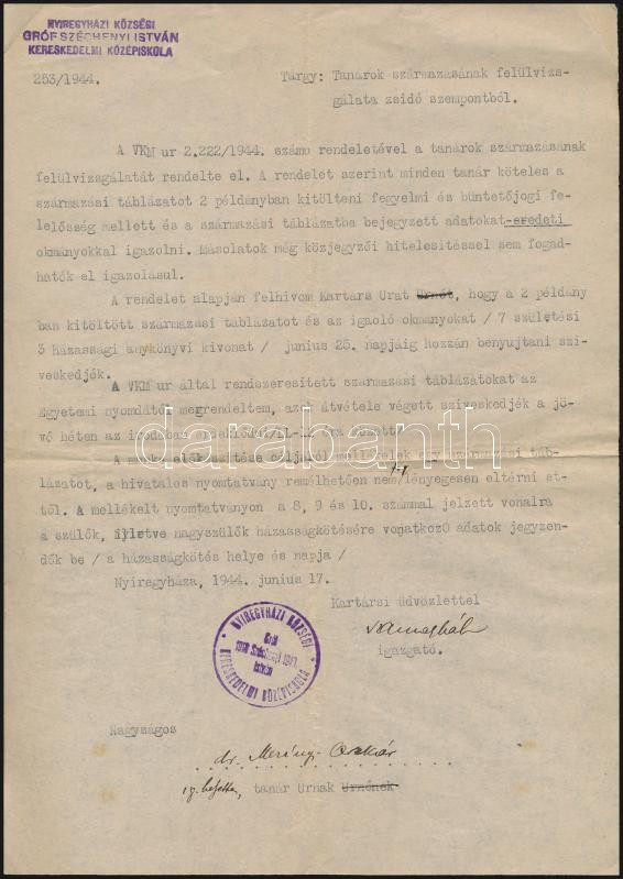 1944 A nyíregyházi felsőkereskedelmi iskola igazgatójának gépelt level... https://www.darabanth.com/hu/310-Gyorsarveres/310.0/Festmeny-mutargy-papirregiseg-egyeb/Okmanyok~17/1944-A-nyiregyhazi-felsokereskedelmi-iskola-igazgatojanak-gepelt-levele-szarmazasi-igazolas~II1689055