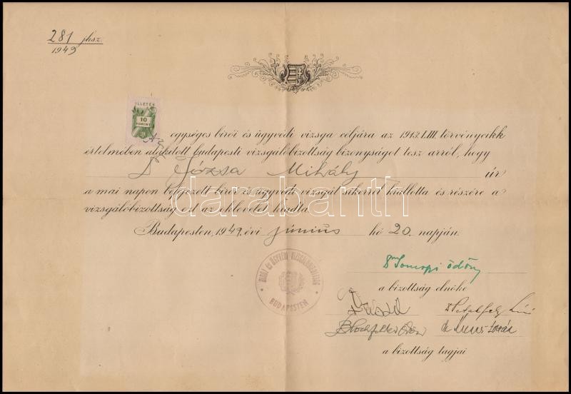 Leírás: 1949 Bírói-ügyvédi vizsgaigazolás, okmánybélyeggel