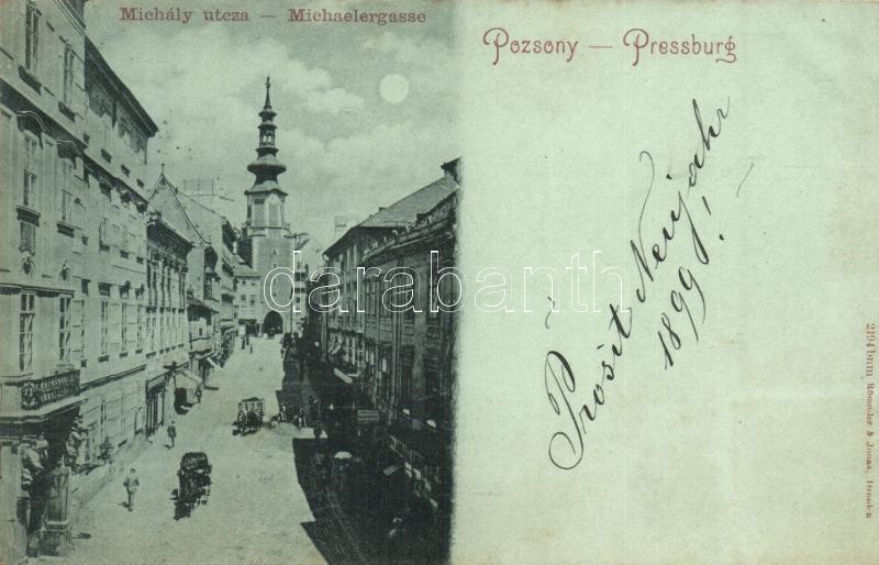 1898 Pozsony, Pressburg, Bratislava; Mihály utca, este / street view, ... https://www.darabanth.com/hu/310-Gyorsarveres/310.0/Kepeslapok/Felvidek~300007/1898-Pozsony-Pressburg-Bratislava-Mihaly-utca-este-street-view-night~II1692627