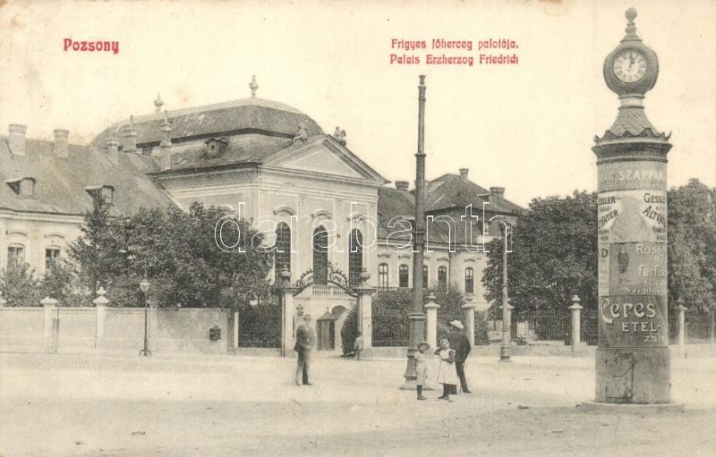 Pozsony, Pressburg, Bratislava; Frigyes főherceg palotája, hirdetőoszl... https://www.darabanth.com/hu/310-Gyorsarveres/310.0/Kepeslapok/Felvidek~300007/Pozsony-Pressburg-Bratislava-Frigyes-foherceg-palotaja-hirdetooszlop-oraval-Bediene-dich-a~II1693692