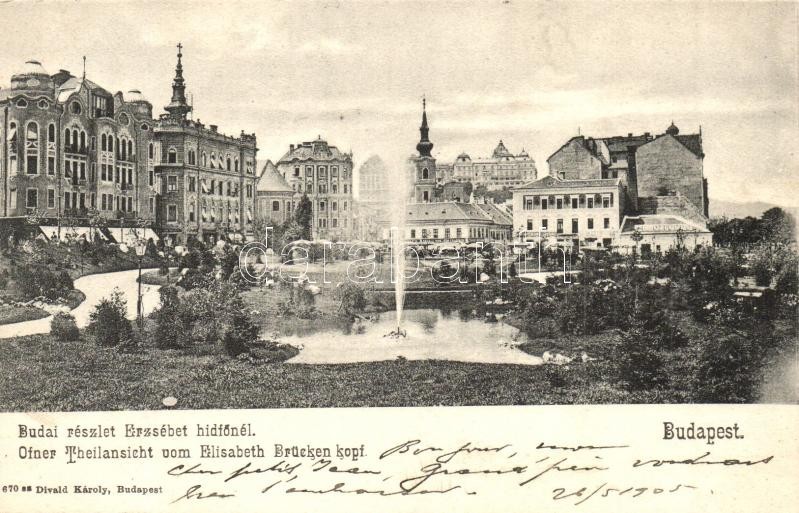 Leírás: Budapest I. Tabán az Erzsébet hídfőnél, Döbrentei tér, Rácz fürdő, Keller Ignácz tabáni sör és borcsarnoka, Divald Károly 670.