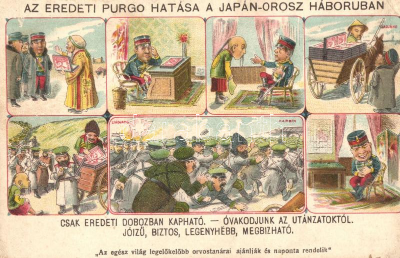 Az eredeti Purgo hatása a Japán-Orosz háborúban, humoros grafikai reklámlap / Purgo laxative advertisement, humorous graphic art posctard, Russo-Japanese war, litho (EK)