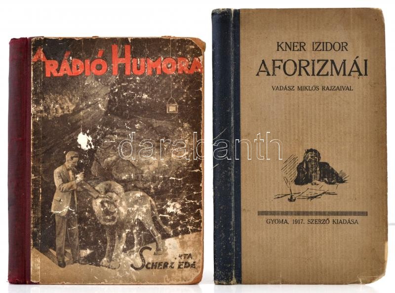 Humoros könyv tétel, 2 db: Kner Izidor aforizmái. Vadász Miklós rajzaival, Gyoma, 1917, Szerző kiadása. Scherz Ede: A rádió humora. Bp., 1931, Szerző kiadása. Kiadói félvászon kötésben, kissé viseltes állapotban.