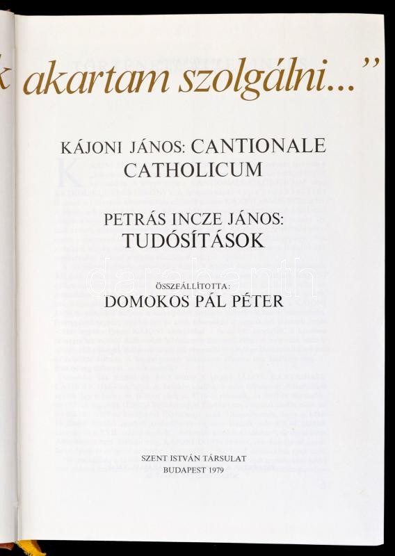 Leírás: "...édes Hazámnak akartam szolgálni..." Kájoni János: Cantionale Catholicum; Petrás Incze János: Tudósítások. Összeáll.: Domokos Pál Péter. Bp., 1979, Szent István Társulat. Műbőr kötésben, papír védőborítóval, jó állapotban.