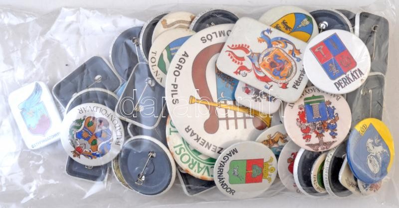 Zacskónyi műanyag, modern, főleg magyar városi jelvény, közte Balatonendréd, Pétervására, Balassagyarmat, Balatonföldvár, Gyál, Kápolnásnyék, Csabrendek, Bugyi T:2,2-