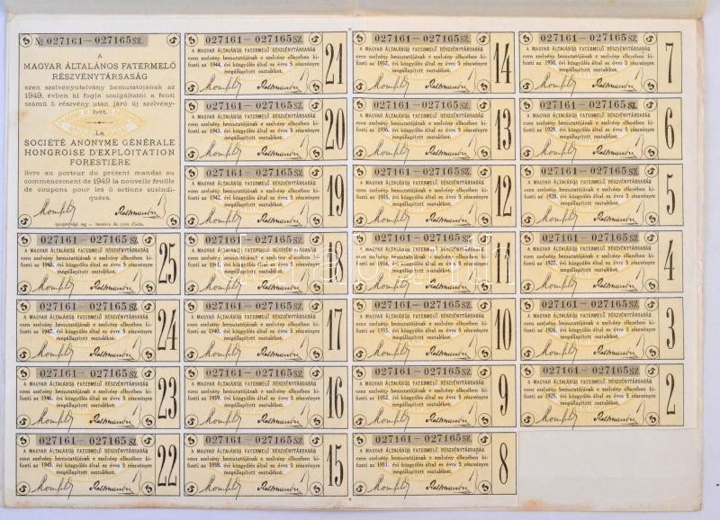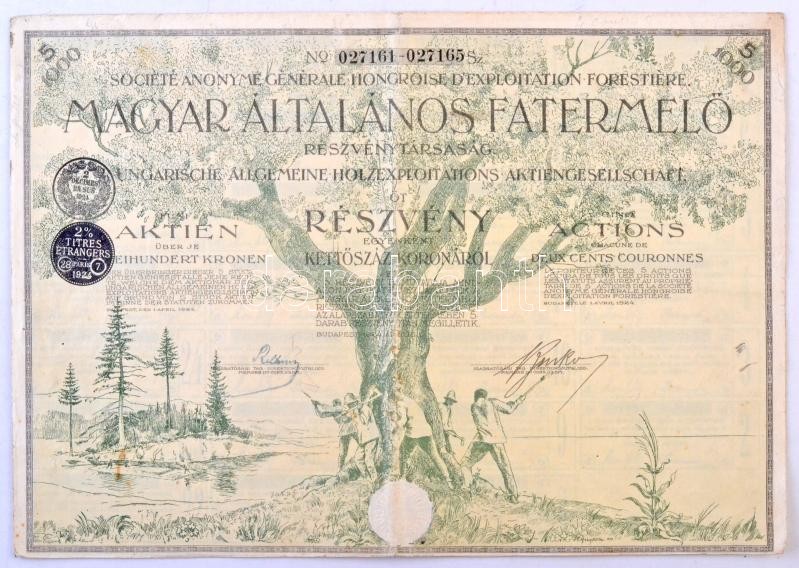 Budapest 1924. "Magyar Általános Fatermelő Részvénytársaság" öt részvénye egyenként 200K-ról, német, magyar és francia nyelven, szárazpecséttel, bélyegzésekkel és szelvényekkel T:III,III-