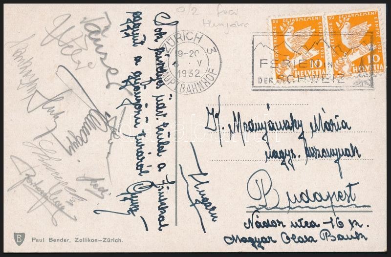 1932 A Hungária labdarúgó csapat tagjainak aláírása képeslapon Mednyánszky Mária 18-szoros asztalitenisz válogatott részére, Cseh II. Újvári, Mandl, Hauser, Weber, Kalmár, Hirzer, Titschka, / Autograph signed postcard of Hungarian football team