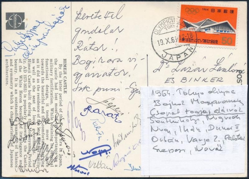 1964 A tokiói olimpia magyar résztvevőinek (Szentmihályi, Nógrádi, Varga, Nagy, Ihász, Dunai II. Orbán, Varga Zoltán, Palotai Szepesi, Novák.) aláírásai Japánból küldött levelezőlapon
