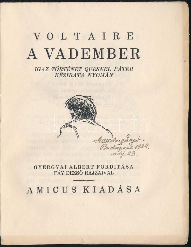 Leírás: Fáy Dezső (1888-1954) festő, grafikus dedikálása Voltaire: A vadember című könyvtöredékén