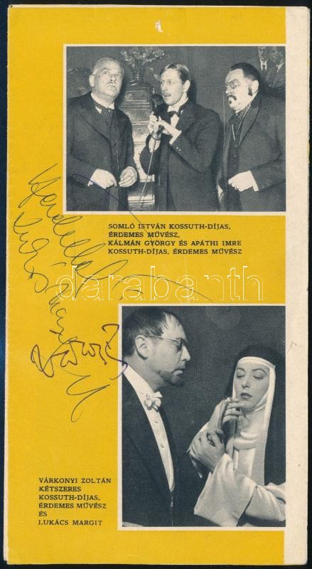 Leírás: Gobbi Hilda, Lukács Margit, Major Tamás, Várkonyi Zoltán színművészek aláírásai a Nemzeti Színház egy prospektusán