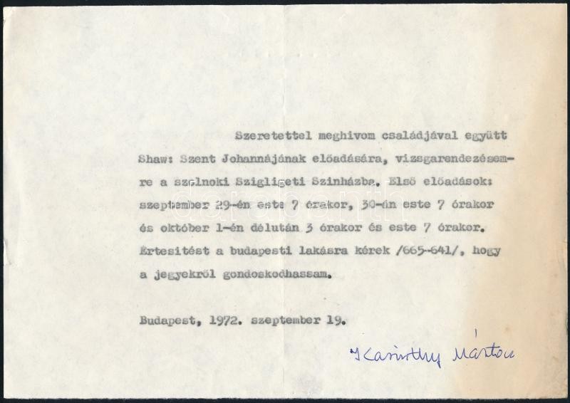 Karinthy Márton (1949-) rendező által aláírt meghívó https://www.darabanth.com/hu/311-Gyorsarveres/311.0/Festmeny-mutargy-papirregiseg-egyeb/Alairas~300018/Karinthy-Marton-1949-rendezo-altal-alairt-meghivo~II1694134