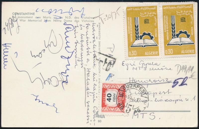 Leírás: cca 1966 Haladás labdarúgócsapat játékosainak és vezetőinek aláírása Algériából, Egri Gyula MTS elnöknek címzett képeslapon
