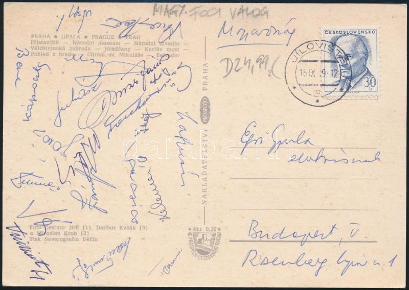 Leírás: cca 1969 Válogatott labdarúgó csapat (Bene, Juhász, Káposzta, stb.) aláírása Prágából, Egri Gyula MTS elnöknek címzett képeslapon