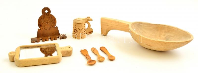 Leírás: Különféle fa tárgyak: kanál, tükör, stb.