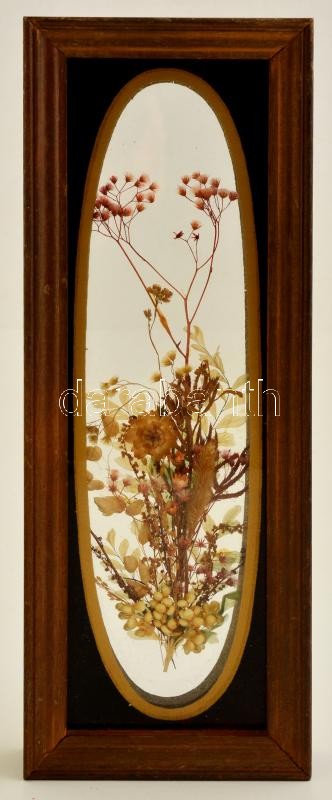 Leírás: Szárított virágokból készült falikép, üvegezett fa keretben, 30,5x11 cm