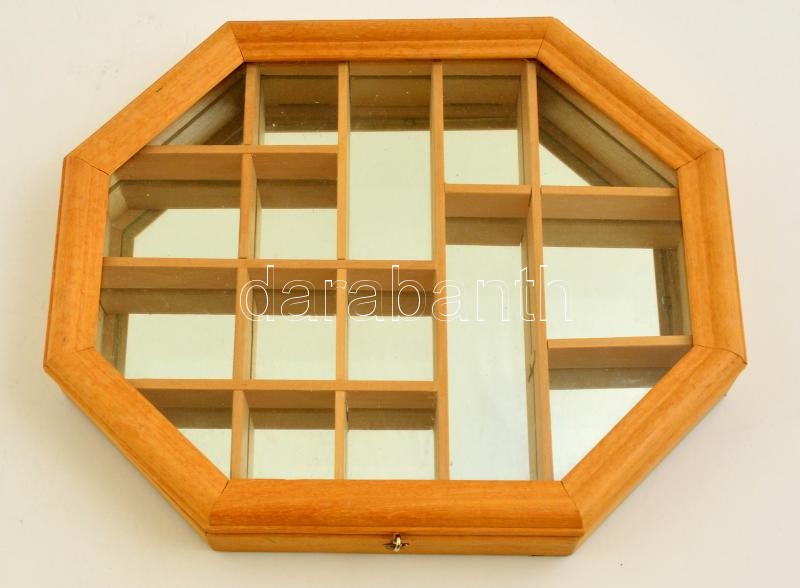 Leírás: Tükrös kisméretű fa vitrin, 28x23,5x4,5 cm