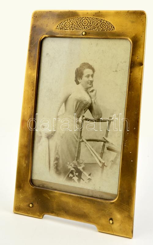 Leírás: cca 1900 réz fényképtartó, régi fotóval, 27×17 cm