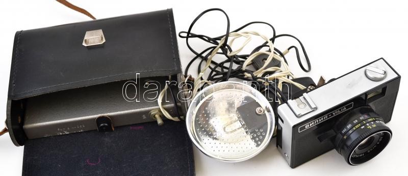Belomo Vilia fényképezőgép Triplet 69-3 4/40 objektívvel, eredeti tokjában + Csajka orosz gyártmányú hordozható vaku, saját tokjában, mindkettő jó állapotban
