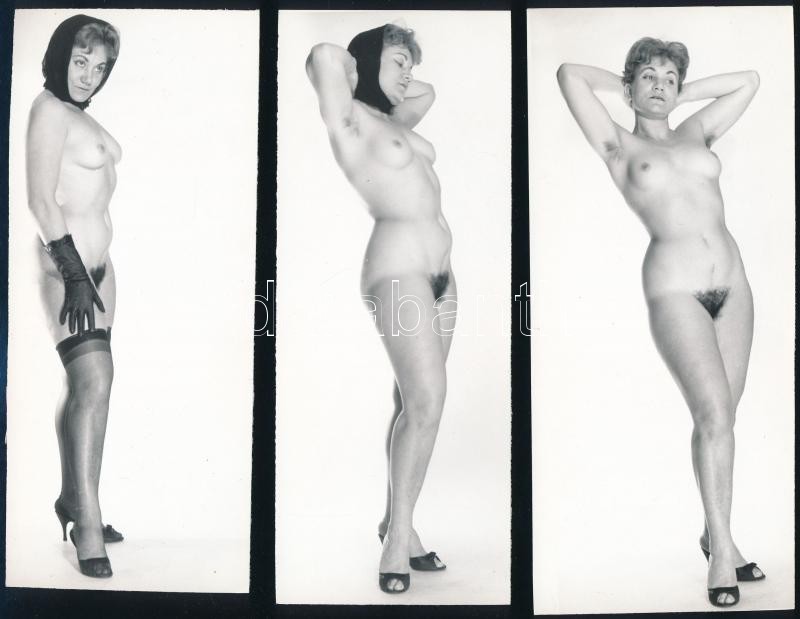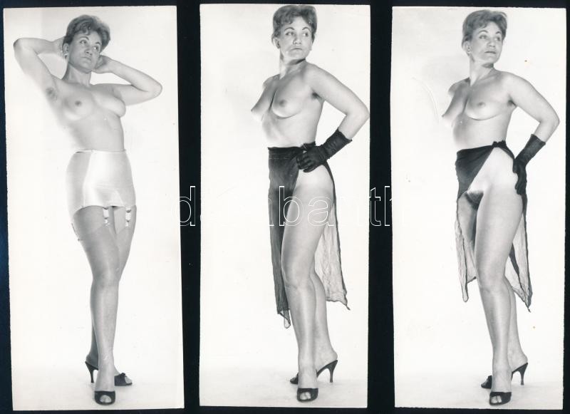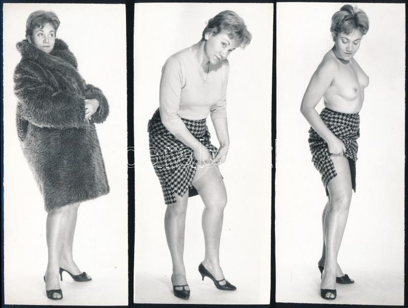 Leírás: cca 1969 Vetkőzőszám negyven felett, 9 db szolidan erotikus vintage fénykép, 17,5x8 cm / 9 erotic photos