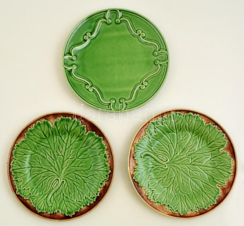 Leírás: Antheor francia (1db) és Caldas de Rainha (2db) mázas kerámia tálak, jelzett, lepattanással, d: 26 cm (x2), és d: 27 cm