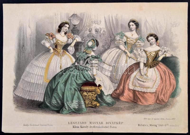 Leírás: 1860 Legujabb magyar divatkép, színezett litográfia, melléklet a Nővilág 1860 6. számában, Pest, Heckenast Gusztáv, hosszában hajtásnyommal, kis szakadással, 28x40 cm.