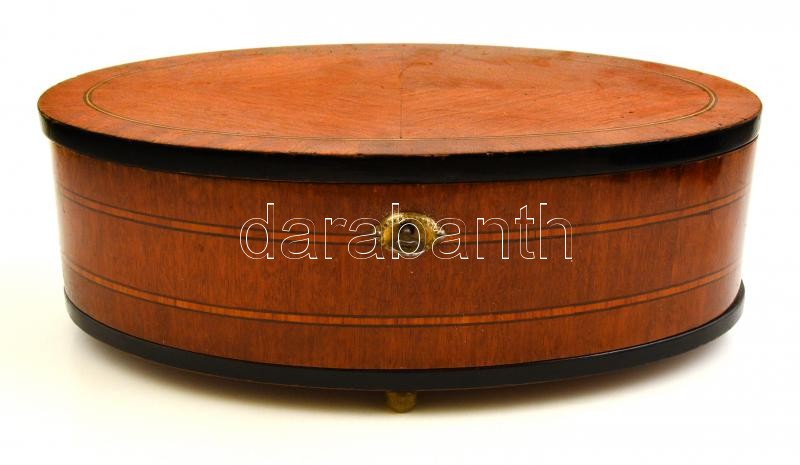 Leírás: Intarziás biedermeier ovális fa doboz, kulccsal, kis hibákkal, m:11 cm, 20,5×32,5 cm