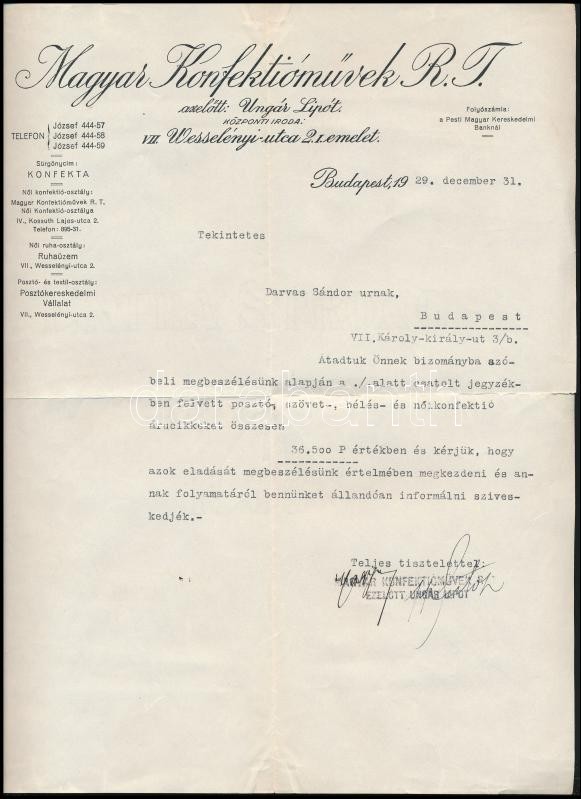 1929 Magyar Konfektióművek Rt., díszes fejléces számla, 29,5x23 cm https://www.darabanth.com/hu/311-Gyorsarveres/311.0/Festmeny-mutargy-papirregiseg-egyeb/Okmanyok~300016/1929-Magyar-Konfektiomuvek-Rt-diszes-fejleces-szamla-29-5x23-cm~II1701563