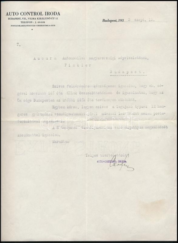 1933 Auto Control Iroda fejléces levél, 29,5x23 cm https://www.darabanth.com/hu/311-Gyorsarveres/311.0/Festmeny-mutargy-papirregiseg-egyeb/Okmanyok~300016/1933-Auto-Control-Iroda-fejleces-level-29-5x23-cm~II1701414