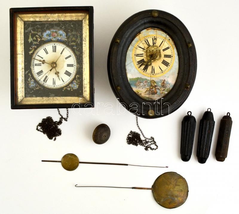 XIX. sz. eleji, XVIII. sz. végi ingajáratos, felesütős faliórák erősen javítandó állapotban. Egyik számlapján festett lovas jelenettel 27x23 cm, 25x20 cm / Vintage clock mechanics for parts
