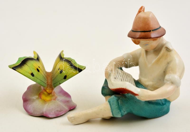 Leírás: Drasche pillangó és olvasó fiú, kézzel festett, jelzett, hibátlan, 6,5×6,5 cm