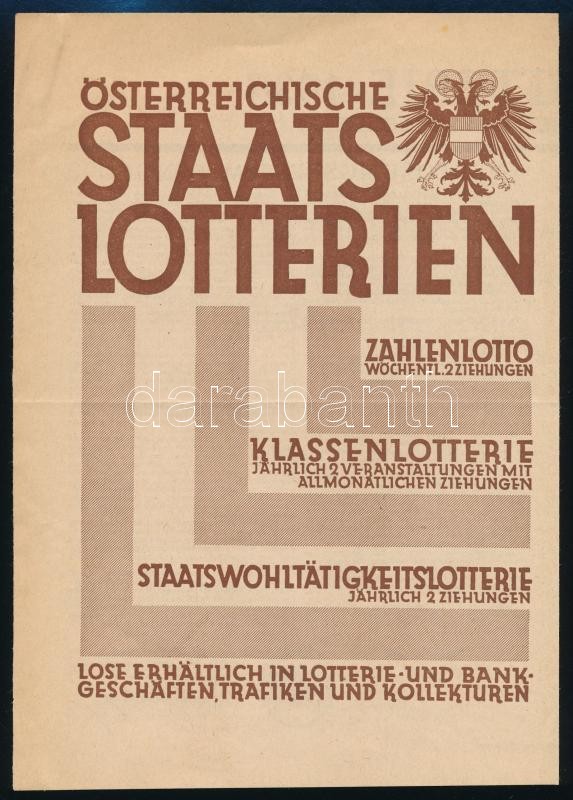 Ausztria 1936 Osztálysorsjáték reklám https://www.darabanth.com/hu/311-Gyorsarveres/311.0/Festmeny-mutargy-papirregiseg-egyeb/Reklam~300020/Ausztria-1936-Osztalysorsjatek-reklam~II1704487