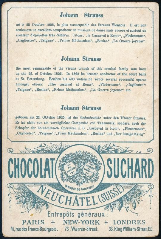 Chocolat Suchard - Johann Strauss litho kártya, 10,5x7 cm https://www.darabanth.com/hu/311-Gyorsarveres/311.0/Festmeny-mutargy-papirregiseg-egyeb/Reklam~300020/Chocolat-Suchard--Johann-Strauss-litho-kartya-10-5x7-cm~II1699100