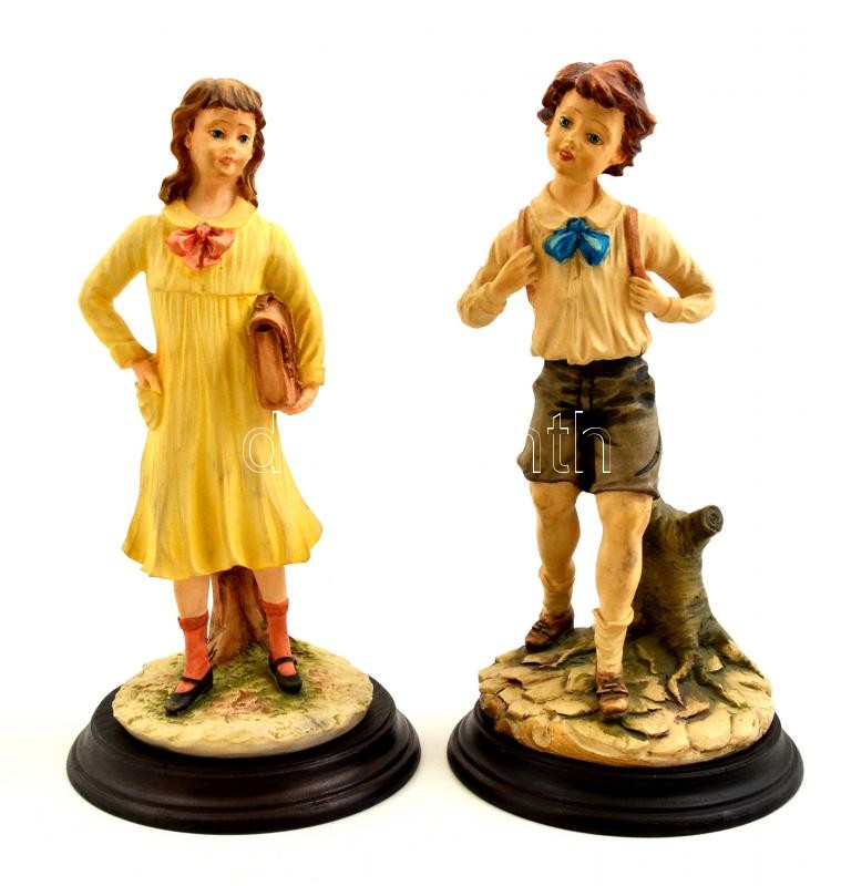 Leírás: Capodimonte iskolás lány és fiú, festett műgyanta, jelzett, kopott, fa talapzaton, m:24 cm (2×)