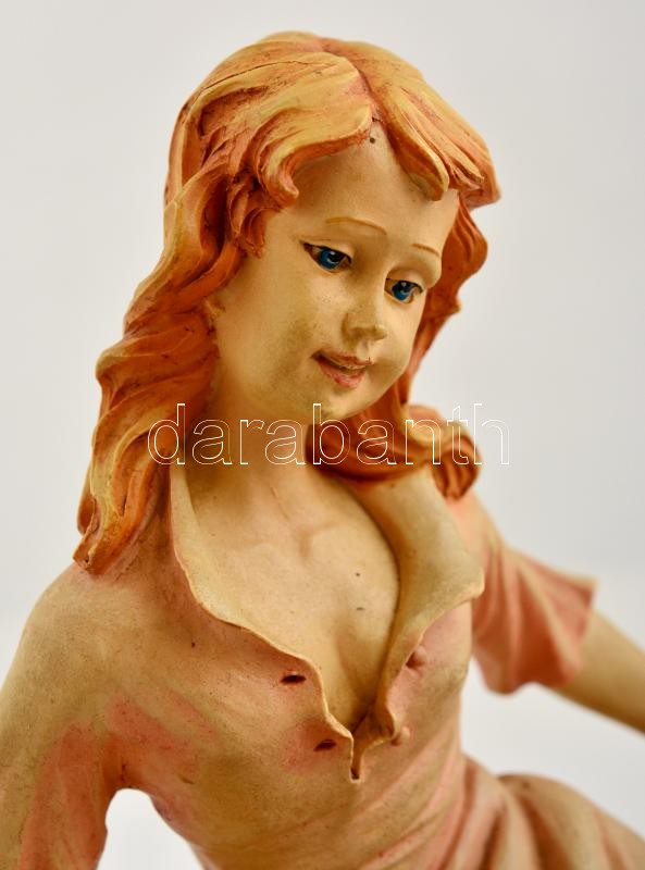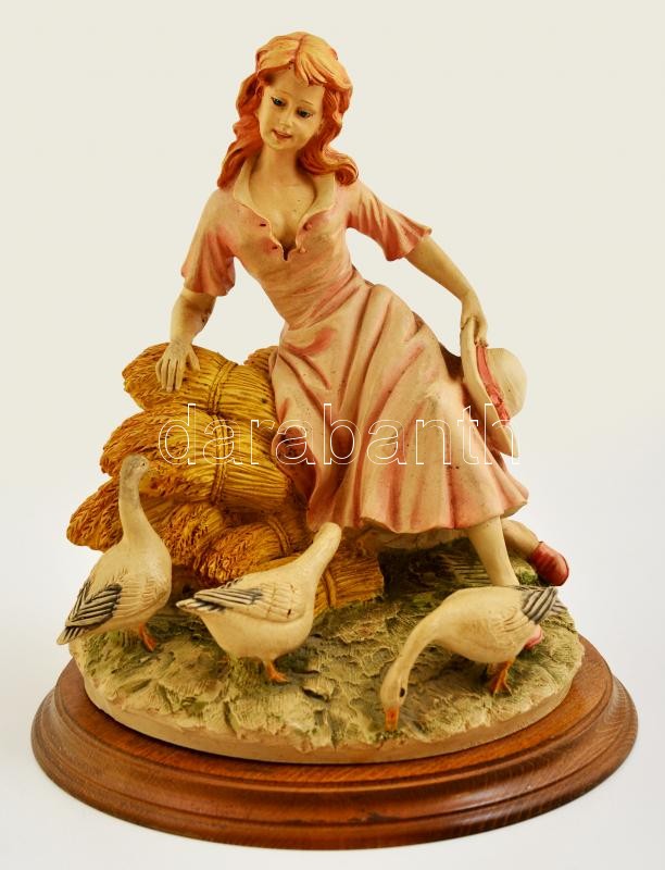 Leírás: Capodimonte kalapos hölgy libákkal, festett műgyanta, jelzett, kopott, fa talapzaton, m:25 cm