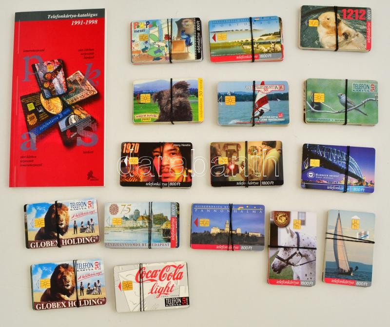 Leírás: 160 db magyar telefonkártya különböző témákban + Telefonkártya-katalógus 1991-1998