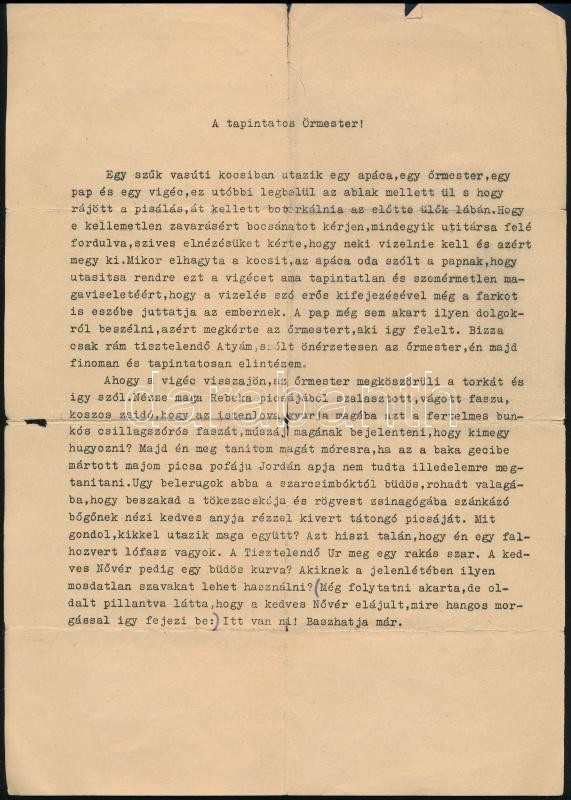 Leírás: cca 1930-1940 "A tapintatos őrmester" - antiszemita, tárágár anekdota, egy gépelt oldal