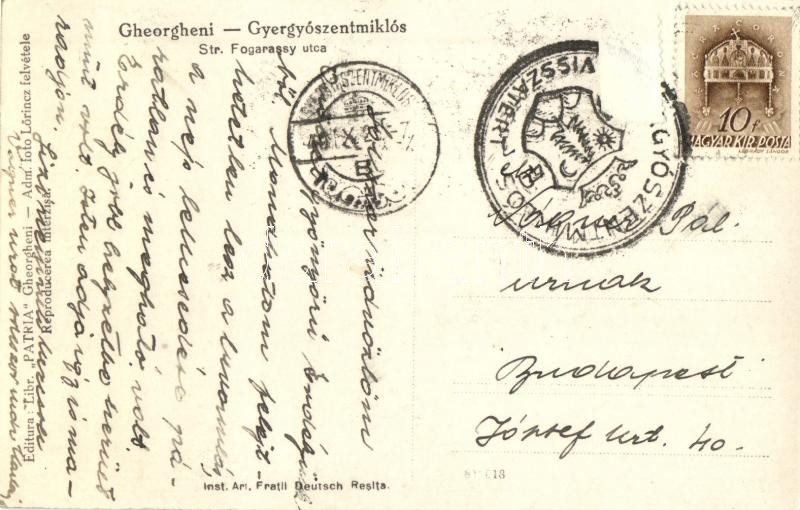 Leírás: Gyergyószentmiklós, Gheorgheni; Fogarassy utca, tanintézet / street view, school + 1940 Gyergyószentmiklós visszatért So. Stpl.