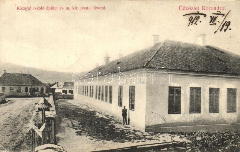 Leírás: Korond, Corund; Községi iskola és m. kir. posta hivatal. Dunky Fivérek kiadása / school, post office (EK)