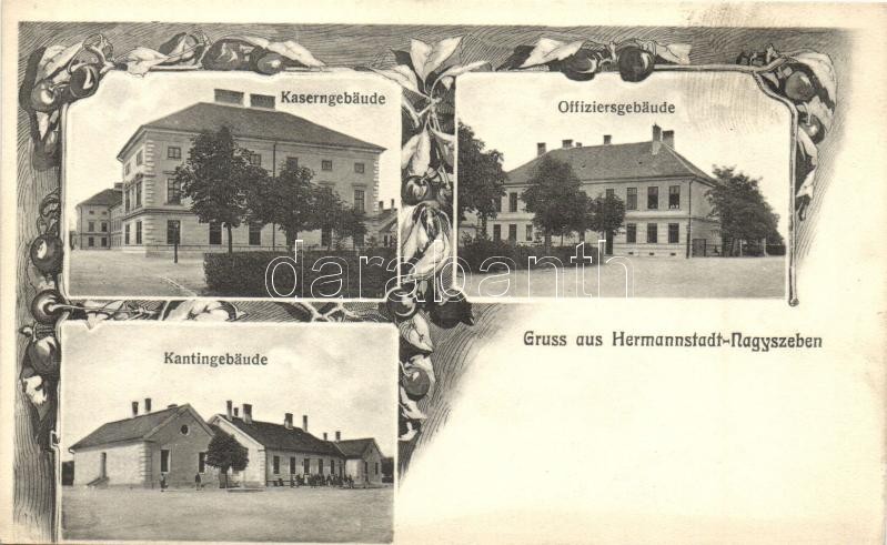 Leírás: Nagyszeben, Hermannstadt, Sibiu; Kaserngebäude, Offiziersgebäude, Kantingebäude. Verlag Martin Bening Kantineur / K.u.K. katonai laktanya, tiszti épület, kantin / military barracks, officers' building, canteen. floral Art Nouveau (EK)