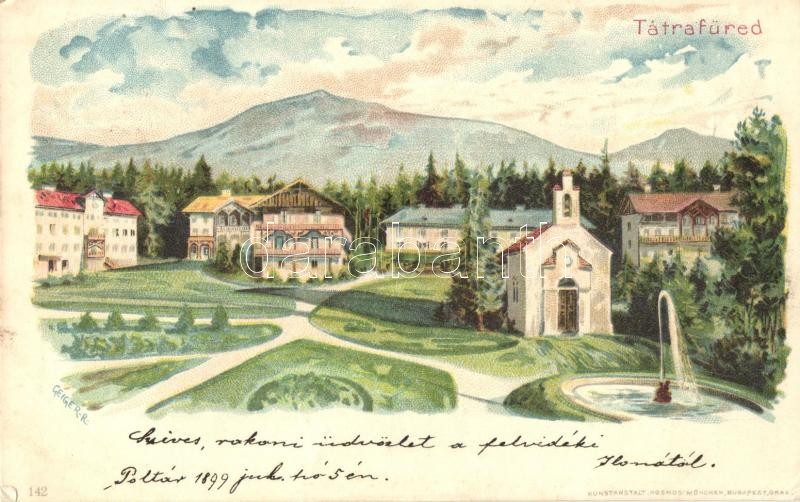 Leírás: 1899 Tátrafüred, Bad Alt-Schmecks, Novy Smokovec; nyaralók / villas. Kunstanstalt Kosmos. Art Nouveau litho s: Geiger R. (EK)