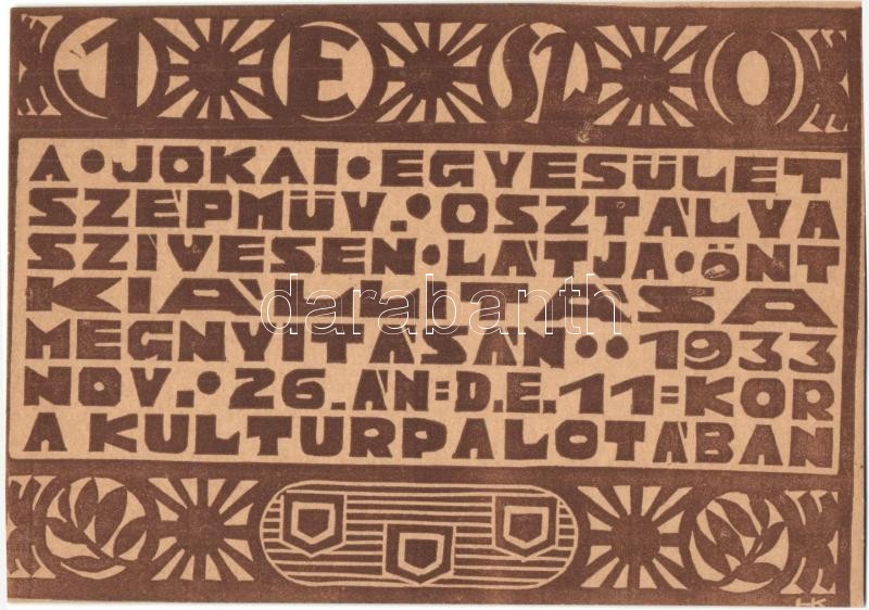 1933 Komárom, Komárno; A Jókai Egyesület Szépművészeti Osztálya szívesen látja Önt kiállítása megnyitásán a Kultúrpalotában / Cultural Association's Fine Arts class' invitation to their exhibition at the Palace of Culture. art postcard