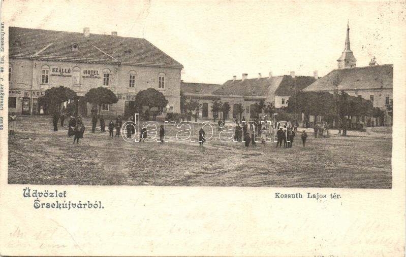 Leírás: Érsekújvár, Nové Zamky; Kossuth Lajos tér, Szálló az Arany Oroszlánhoz, Adler üzlete, kiadja Conlegner J. és fia / square, hotel, shops (fa)