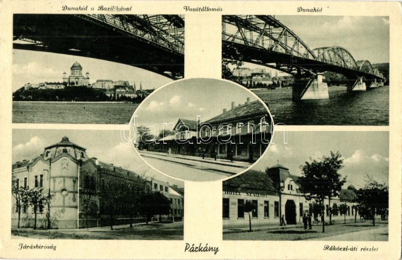 Leírás: Párkány, Stúrovó; Duna-híd a Bazilikával (Esztergom), Vasútállomás, Járásbíróság, Rákóczi út, szálloda / Danube bridge, basilica church, railway station, court, street view, hotel