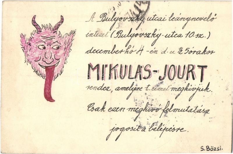 1920 A budapesti Bulyovszky utcai leánynevelő intézet Mikulás zsúr meghívója. Kézzel rajzolt képeslap Krampusszal / Hungarian girls' school invitation card to the Saint Nicholas party with hand-drawn Krampus s: S. Bözsi