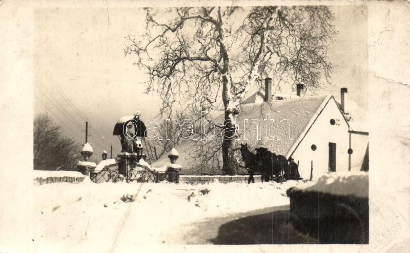 Leírás: 1932 Tata-Tóváros, téli utcakép Szűz anya szoborral. photo (fa)