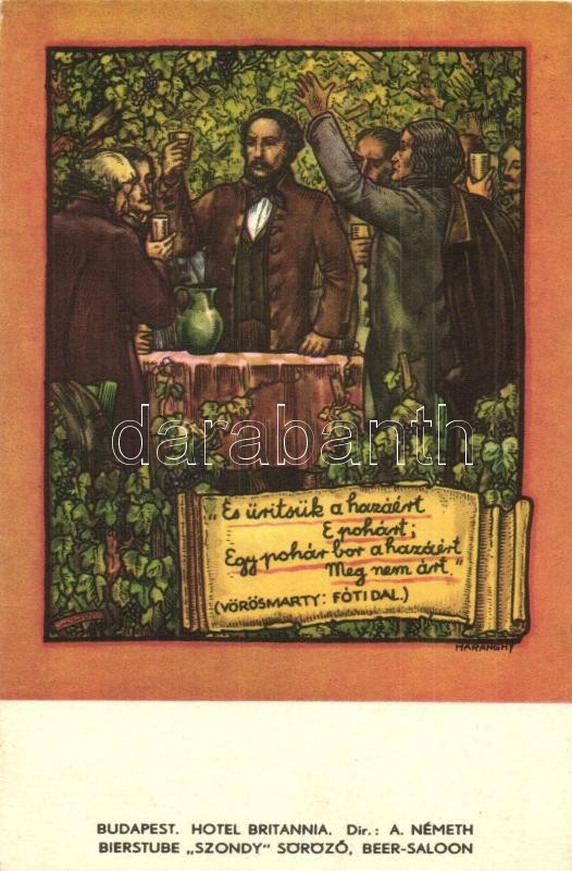 Egy pohár bor a hazáért még nem árt! A budapesti Hotel Britannia és Szondy Söröző grafikai reklámlapja / Hungarian restaurant advertisement card s: Haranghy (EK)