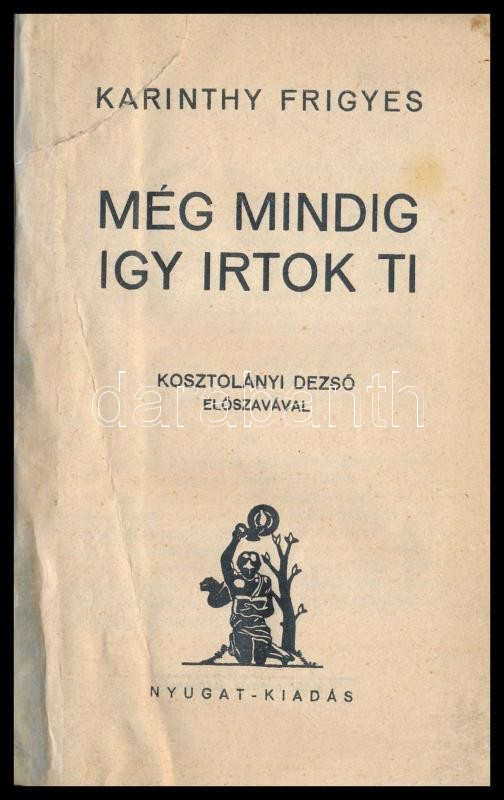 Karinthy Frigyes: Még mindig így írtok ti. Kosztolányi Dezső előszavával. (Bp., 1934), Nyugat,(Viktória-ny.),192 p. Átkötött modern félvászon-kötés, a címlaptól a 11. oldalig a lapok javítottak.