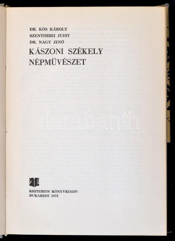 Dr. Kós Károly-Szentimrei Judit-Dr. Nagy Jenő: Kászoni székely népművé... https://www.darabanth.com/hu/311-Gyorsarveres/311.0/Konyvek/Konyvek-Epiteszet-muveszet~300034/Dr-Kos-Karoly-Szentimrei-Judit-Dr-Nagy-Jeno-Kaszoni-szekely-nepmuveszet-Bukarest-1972-~II1694536