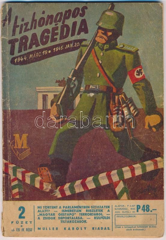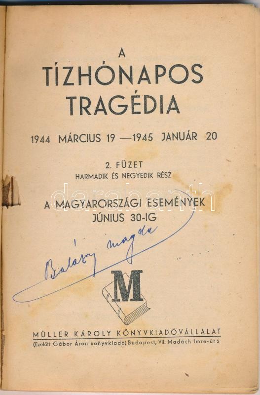 A tízhónapos tragédia. 1944. március 19.-1945. január 20. Második füzet. Harmadik és negyedik rész. A magyarországi események Június 30-ig. Bp., 1945, Müller Károly, (Légrády Testvérek Rt.-ny.) Kiadói papírkötés, kopott borítóval, a gerincen kis szakadással.