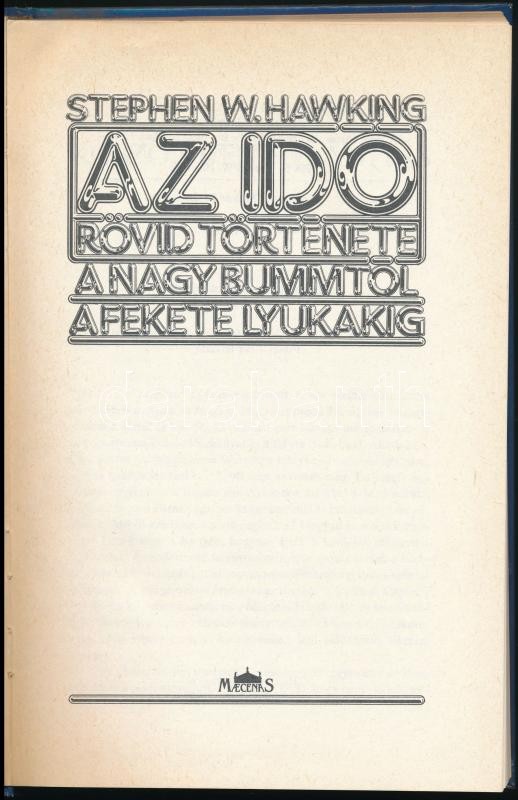 Stephen W. Hawking: Az idő rövid története a nagy bummtól a fekete lyukakig. Fordította: Molnár István. Bp.,1989, Maecenas. Kiadói kartonált papírkötés.